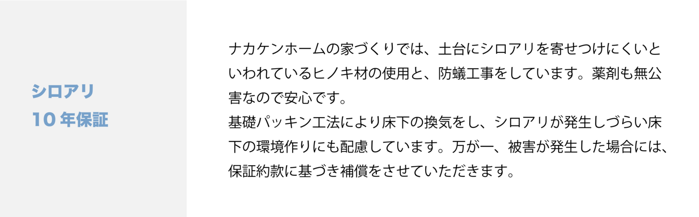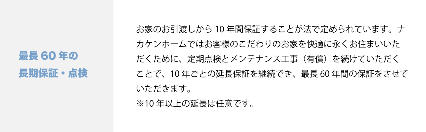 ナカケンホームではお家のお引渡しから10 年間、保証と保険をおつけしています。メンテナンスや補修をすることで安心していつまでも生活できるようサポートさせていただきます。