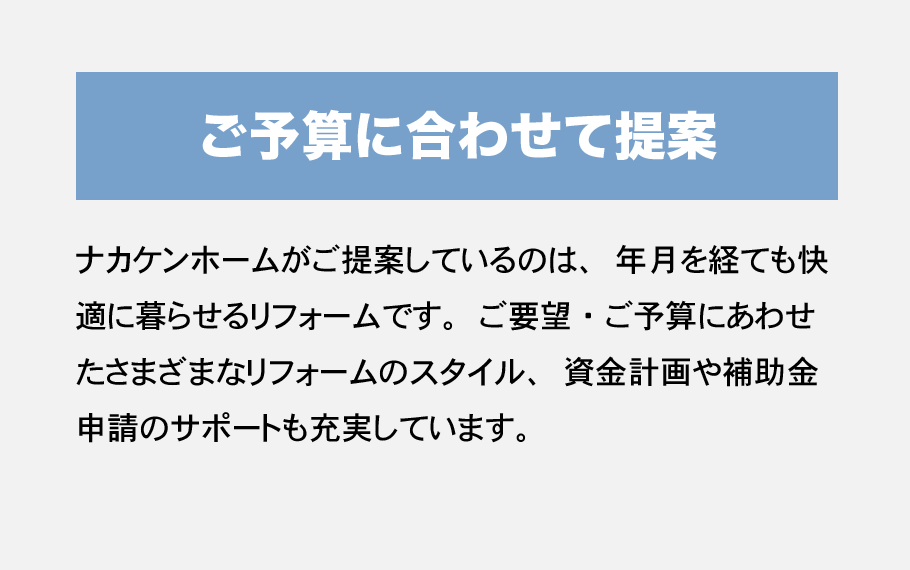 ナカケンホームの水まわりリフォームは、短工期で部分ごとに進めていきますので、今のお家に住みながら快適に工事を進めていくことができます。